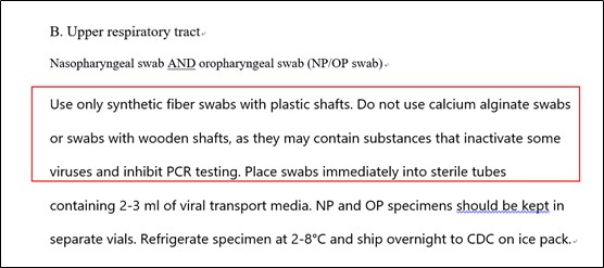 Além disso, o CDC dos EUA emitiu 'Diretrizes provisórias para coleta, manuseio e teste de amostras clínicas de pacientes sob investigação (PUIs) para o novo coronavírus de 2019 (2019-nCoV)' [2] em 2 de fevereiro de 2020, que mostrou os requisitos para o swabs de coleta utilizados na coleta de amostras nasais e faríngeas (ver caixa vermelha)。